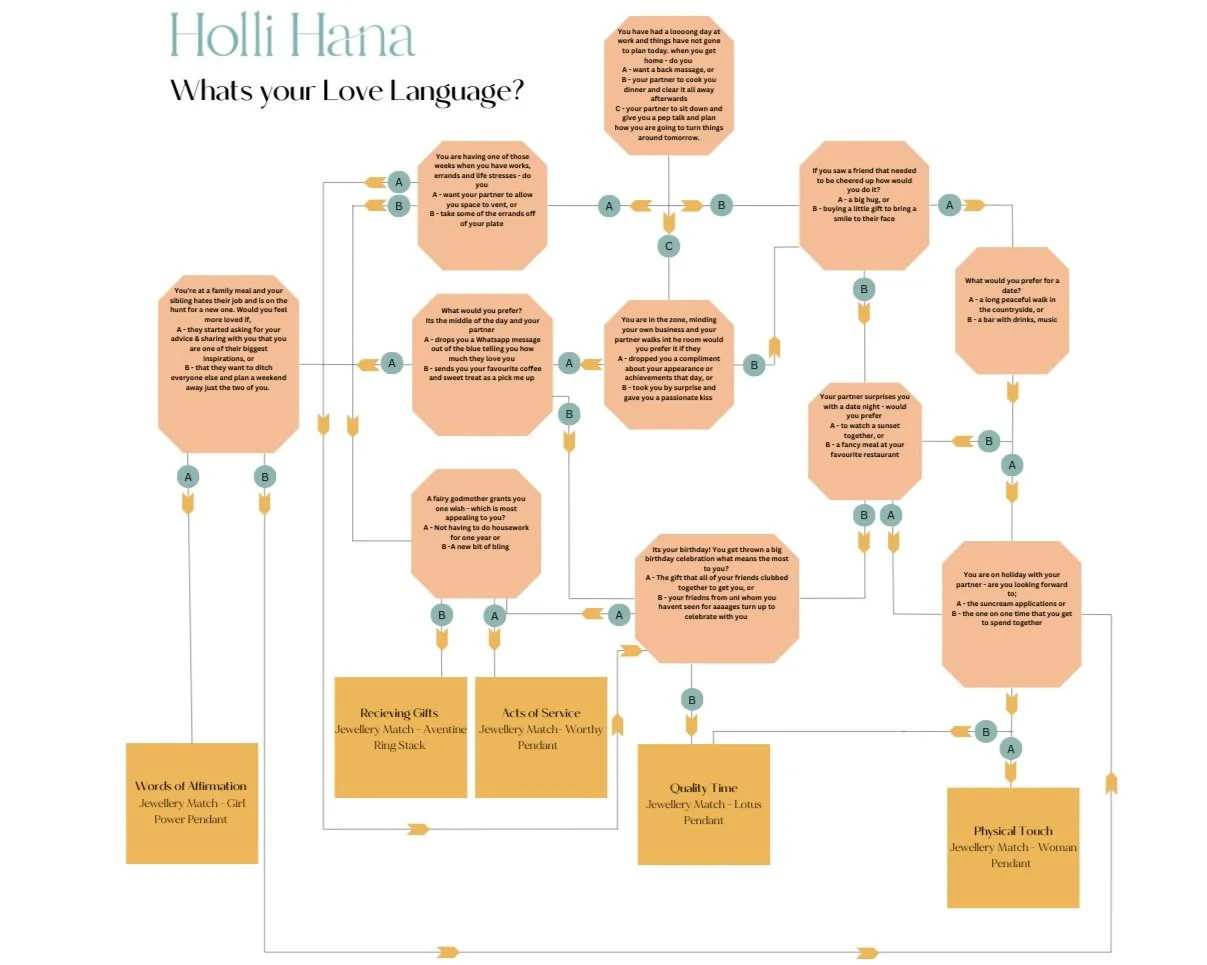 With a throw back to the 90s flowchart quiz find out what your language of love is. Answer the questions and work your way through to find out how you like people to show their love towards you and what you truly value. Extra bonus, why not do this with your partner if they need a bit of gentle guidance to do the dishes or give a foot rub!